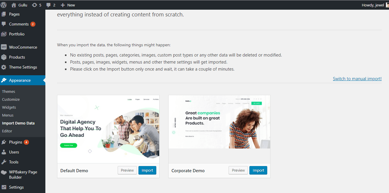 If you failed to import the demo content by one click then you have to follow the below steps to import the demo content manually. You will get all demo content data with the theme package. You will find the demos in ‘charles>inc/demo{disired-demo-number} this path.